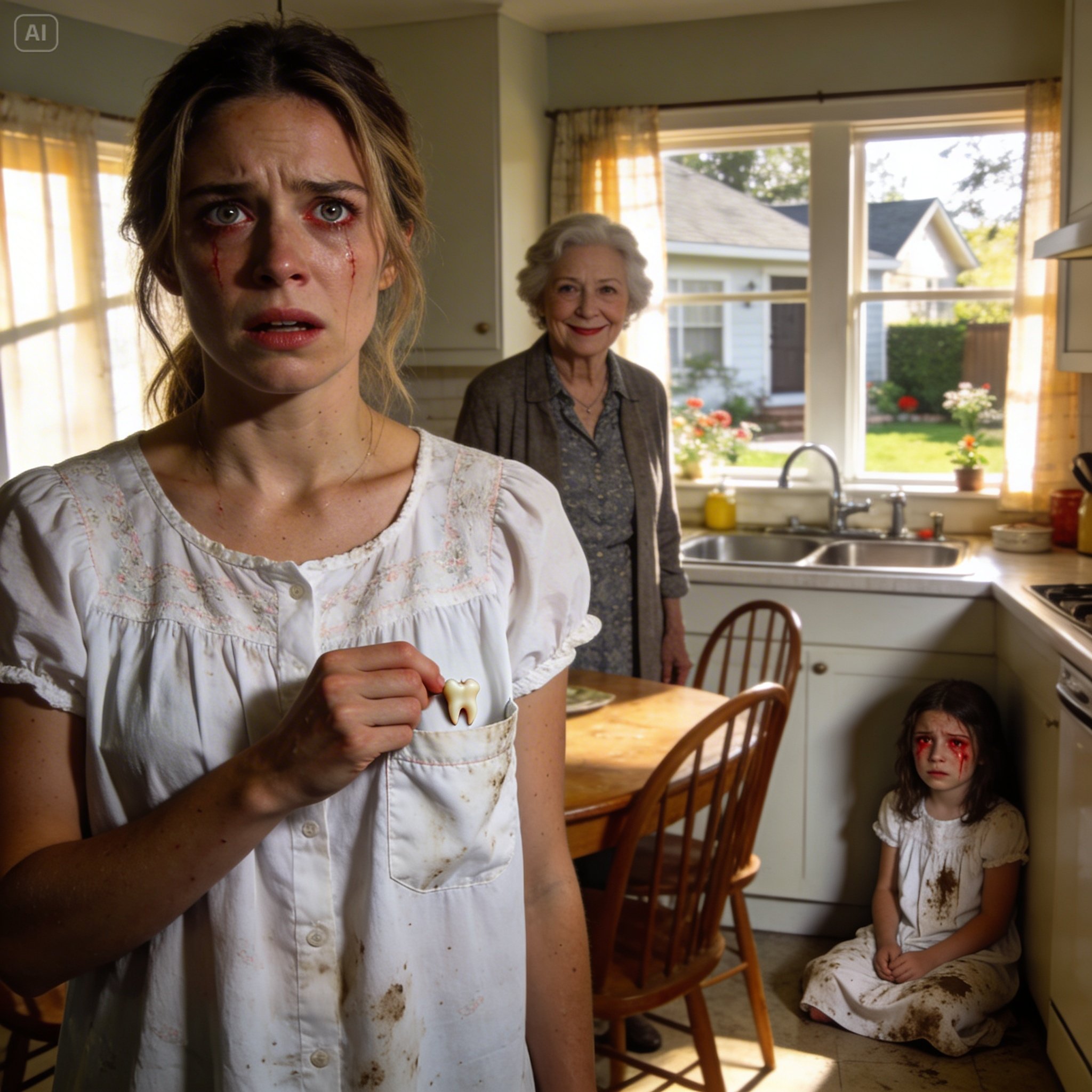 Ma mère a dit vouloir se racheter, alors elle a proposé de garder ma fille pour la nuit afin que je puisse me reposer. Le lendemain matin, quand je suis venue la chercher, ma fille était assise, immobile, dans un coin de la cuisine, sa chemise de nuit tachée de boue, les yeux rouges comme si elle avait pleuré des heures. J’ai demandé ce qui s’était passé, mais ma mère m’a seulement adressé un sourire forcé et a dit que ma fille avait fait du somnambulisme et était allée seule dans le jardin. Cette explication a tenu jusqu’à ce que je lave la chemise de nuit et découvre une dent humaine dans sa poche.