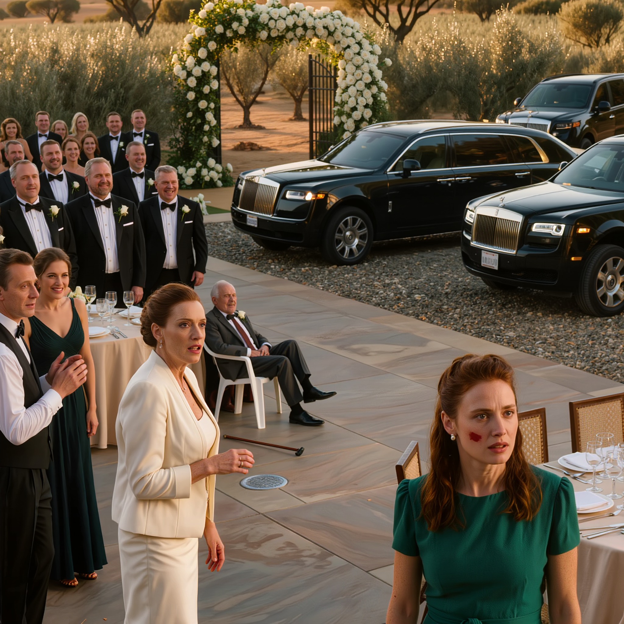 Ma mère essayait de se cacher derrière mon grand-père milliardaire de 82 ans, dissimulé derrière un tas d’ordures, lors du mariage de mon frère à Napa. Quand je lui ai demandé – devant tout le monde – pourquoi de parfaits inconnus étaient assis à la table familiale alors qu’il était coincé sur une chaise en plastique près de la bouche d’aération de la salle à manger, la main de ma mère s’est levée brusquement, un grand bruit a retenti, mon visage s’est enflammé… puis le portail en fer a tremblé tandis qu’un convoi de Rolls-Royce noires descendait l’allée, comme si le domaine avait enfin décidé de répondre.