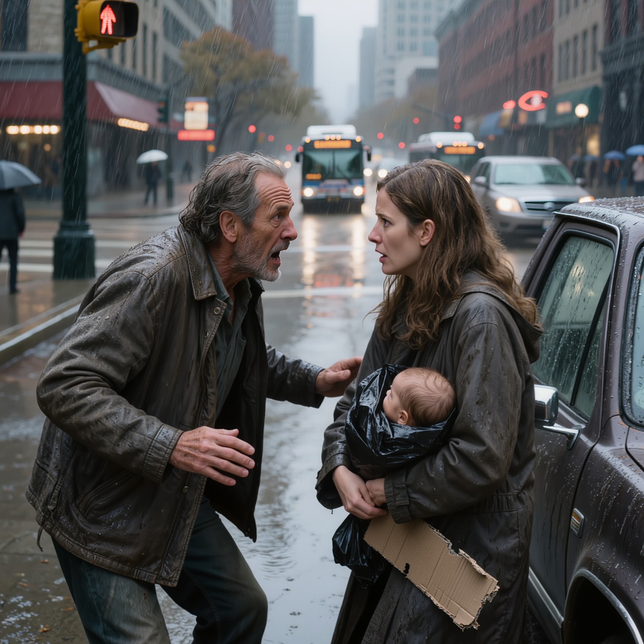 J’ai garé mon pick-up en plein milieu d’une voie de virage à Seattle quand j’ai vu ma fille supplier sous une pluie glaciale, un bébé emmailloté dans des sacs-poubelle. Elle était censée être en sécurité dans son appartement de Bellevue avec son mari, un homme puissant. Mais quand j’ai couru vers elle, les lèvres bleues et tremblante, elle a murmuré : « Papa, non… tu dois partir. Ils nous observent. »