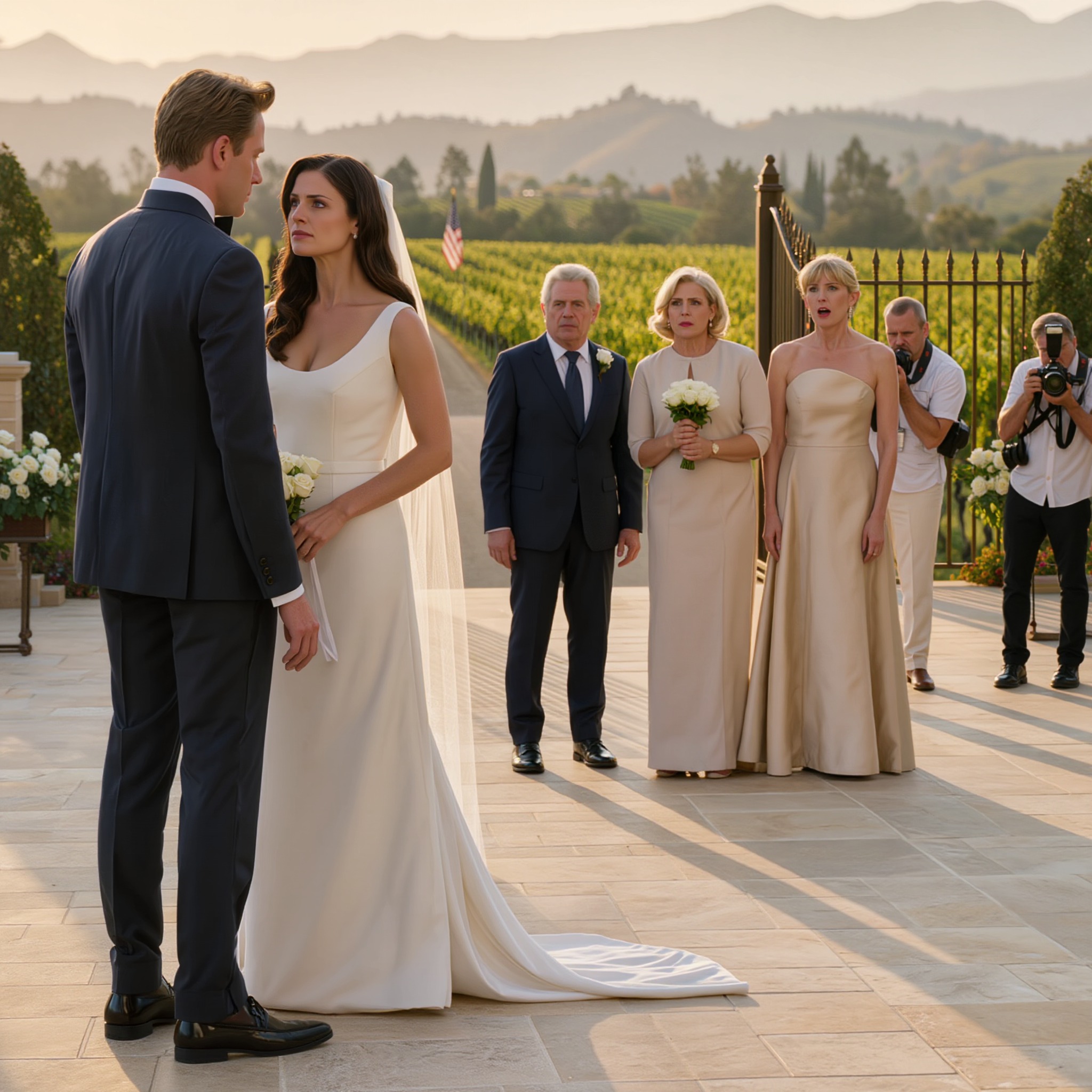 Le soleil déclinait sur la Napa Valley, baignant les vignes d’une douce lumière dorée tandis que les invités commençaient à arriver au domaine Cole. Des rangées de voitures noires gravissaient la colline, leurs phares scintillant comme des lucioles, laissant descendre des hommes en smoking et des femmes en robes chatoyantes sous les derniers rayons du soleil. L’air embaumait les roses et le champagne, portés par une douce brise californienne.