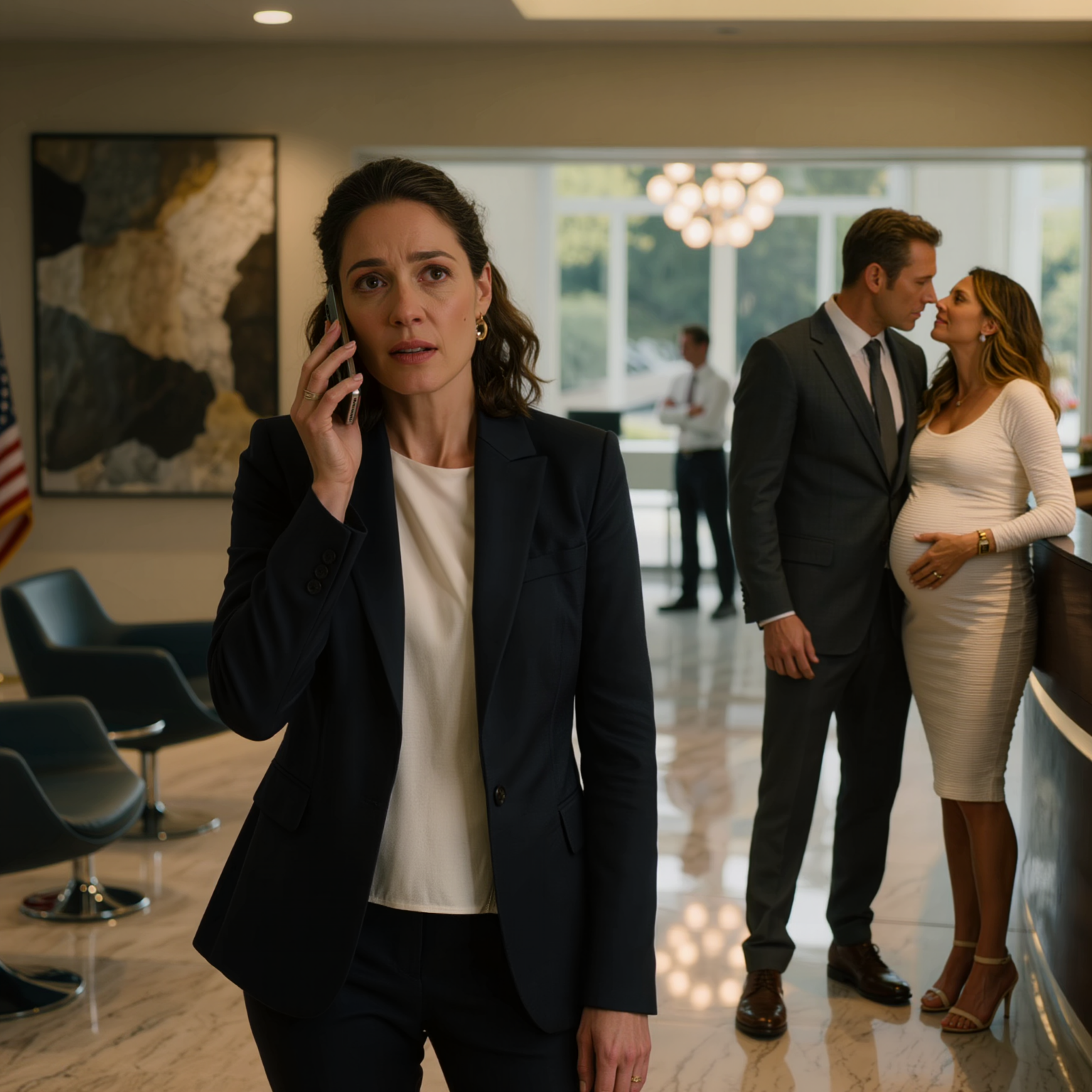 Mia le suivait de près, collée contre lui, parfaitement maquillée, la main posée sur son ventre d’une manière qui attirait tous les regards dans le couloir.