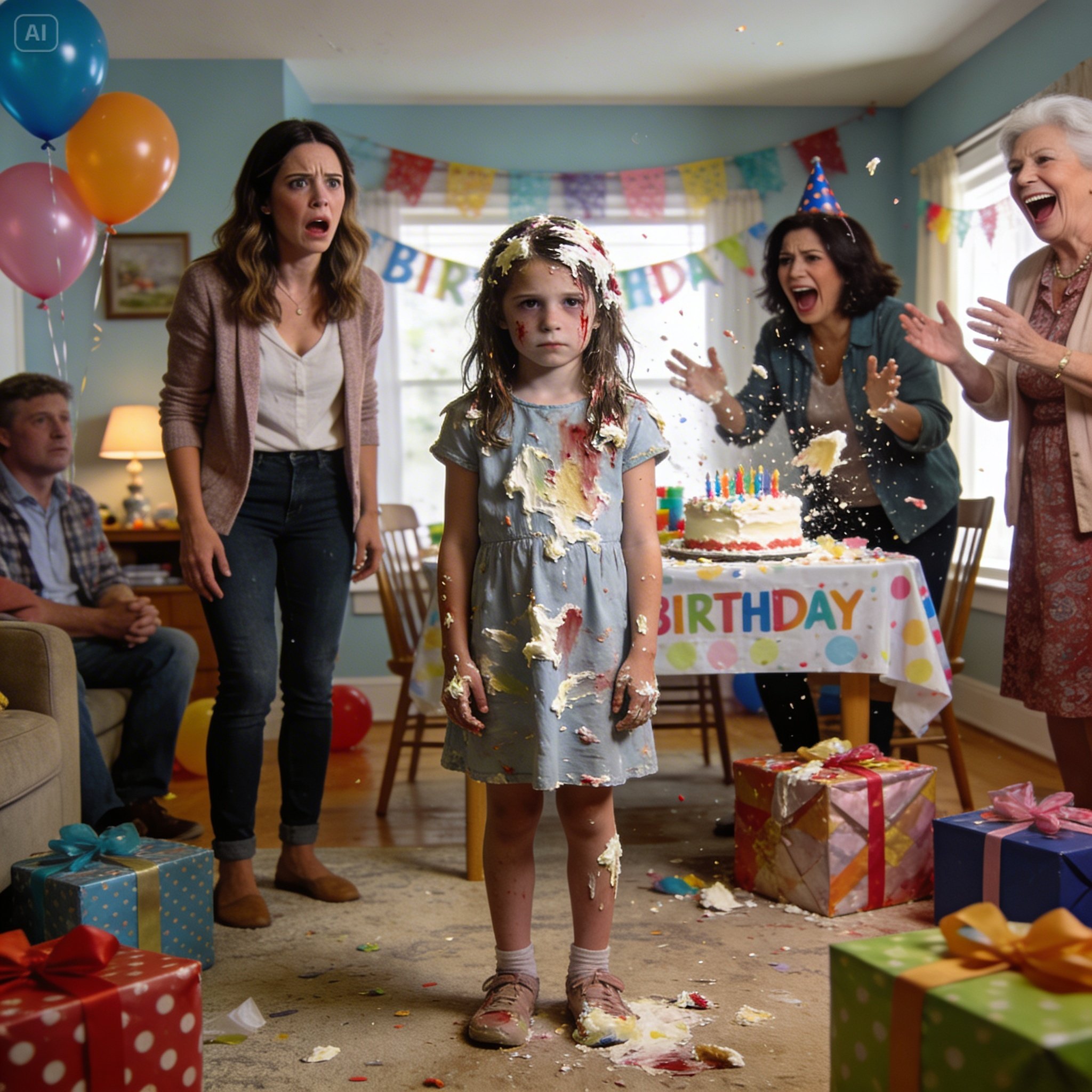 À la fête d’anniversaire de ma fille de 7 ans, ma sœur lui a soudainement enfoncé un gâteau en plein visage. « Joyeux anniversaire ! Surprise ! » a-t-elle crié. Ma mère a éclaté de rire. « C’était inestimable ! » Ma fille est restée figée, le glaçage dégoulinant sur son visage. Puis, lentement, elle s’est tournée vers moi et a dit : « Maman, je peux leur montrer le cadeau maintenant ? » À cet instant précis, tous leurs sourires se sont figés.