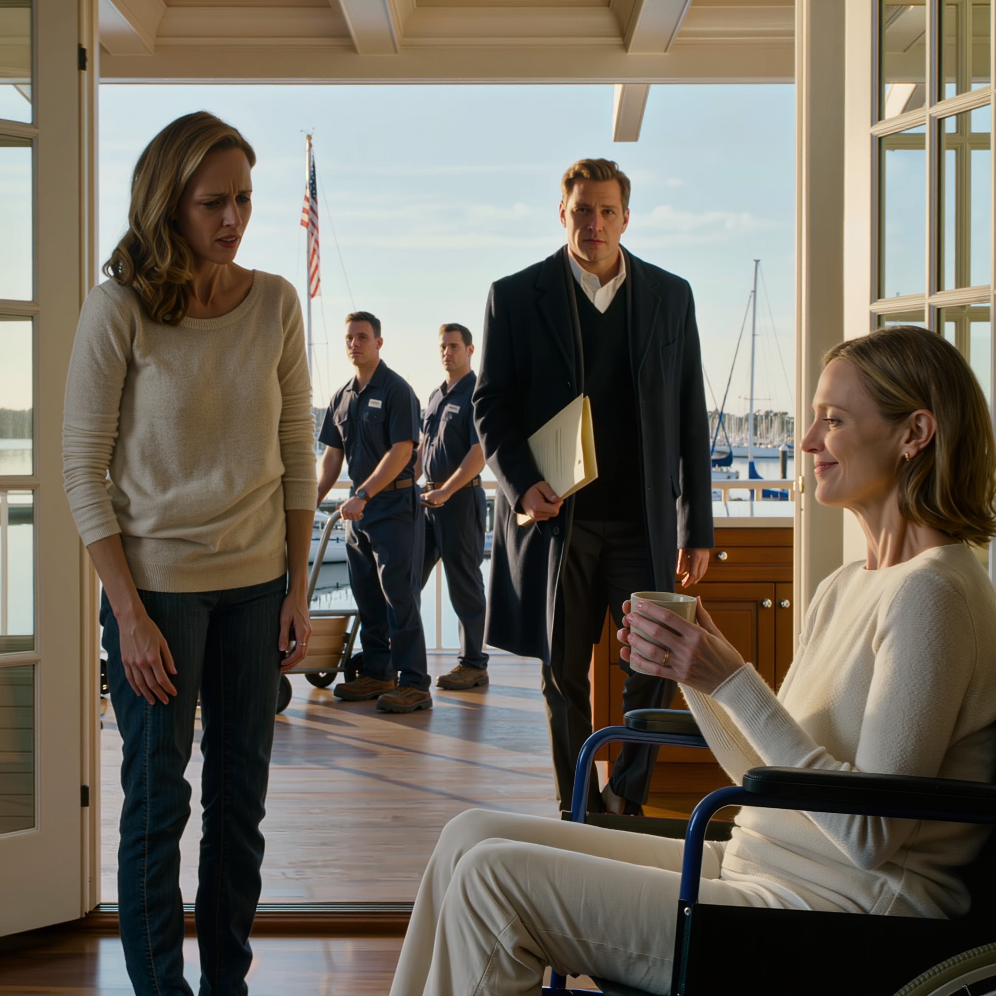 Ce matin-là, j’étais assise dans mon fauteuil roulant près des stores ouverts, sentant le froid des portes vitrées et essayant de comprendre comment ma propre sœur avait pu arriver avec un camion de déménagement avant l’aube.