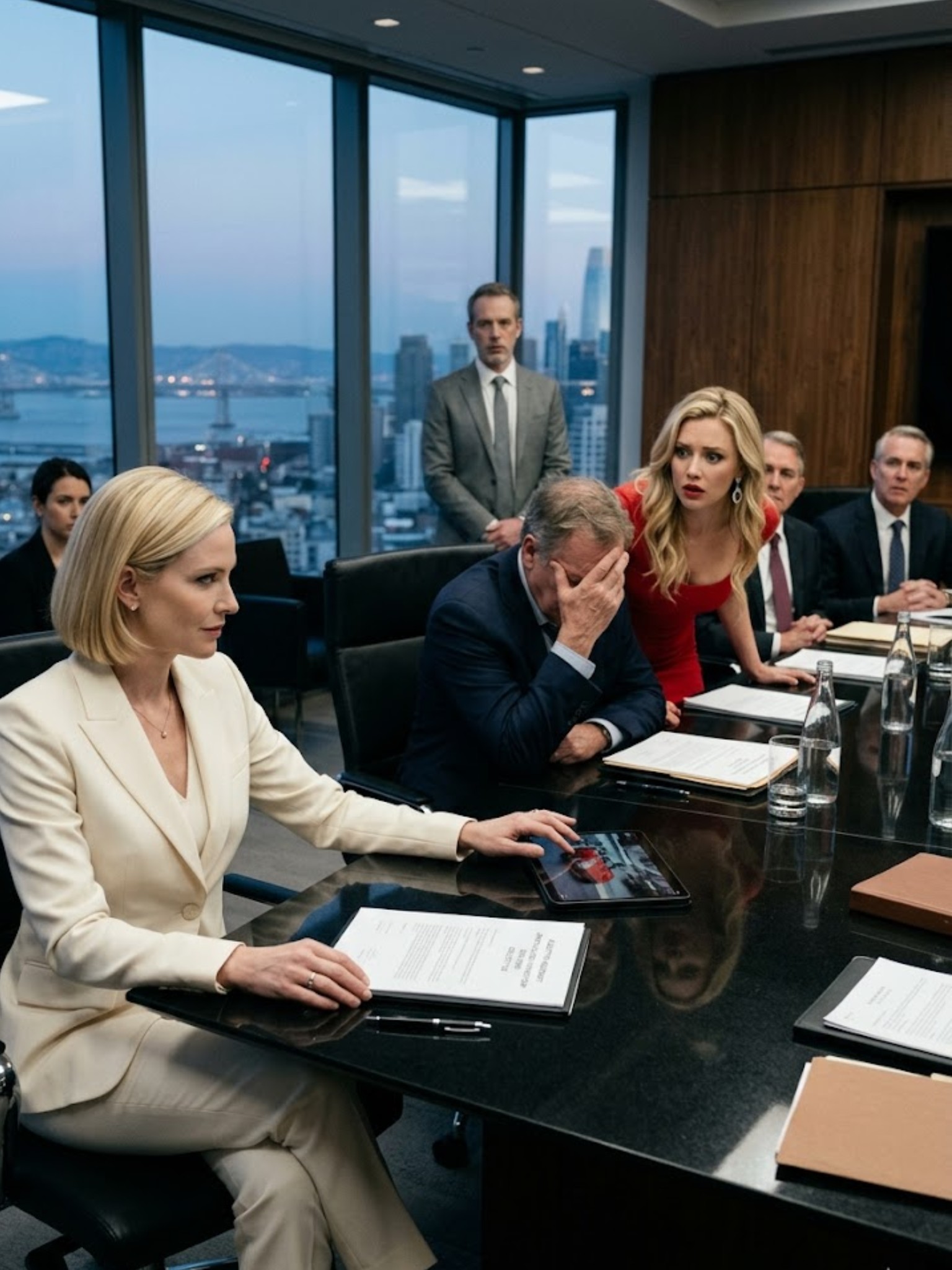Elle était grande, élégante, blonde de ce blond doré flamboyant qui exigeait soit une génétique exceptionnelle, soit un coloriste de grand talent, et elle était vêtue de blanc de la tête aux pieds, comme si le monde entier n’avait été conçu que pour la mettre en valeur. Ses lunettes de soleil étaient surdimensionnées. Sa bouche était rouge. Ses talons étaient de ceux qui se faisaient remarquer avant même qu’elle n’ait à se manifester. Dans une main, elle tenait un porte-documents en cuir à fermoir doré, non pas comme un simple classeur, mais comme une arme.
