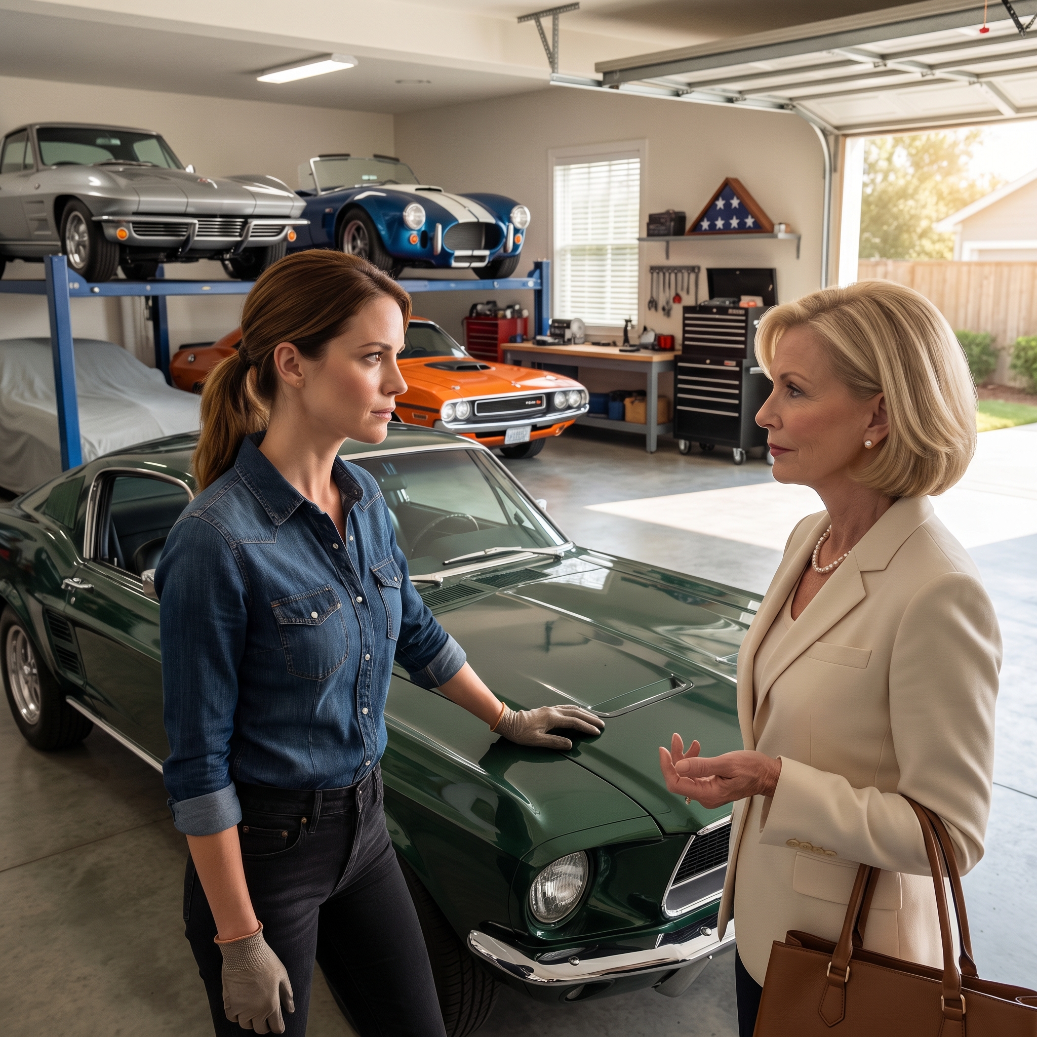 J’étais sous le capot de la Mustang quand j’ai entendu la portière s’ouvrir. La radio sur mon établi diffusait une vieille chanson de Springsteen à faible volume, couverte par le cliquetis de ma clé à douille. J’ai pensé que c’était James qui rentrait plus tôt que prévu, ou peut-être le livreur avec le kit de joints que j’avais commandé. Au lieu de cela, je me suis redressé et j’ai vu Margaret Carter, vêtue d’un blazer en lin couleur crème fouettée, plantée entre ma caisse à outils et la Corvette comme si elle était chez elle.