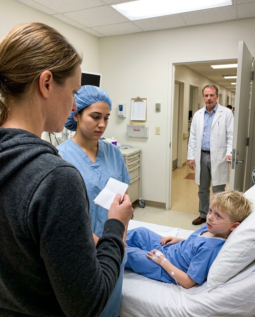 Mon fils de six ans était à l’hôpital. J’ai couru le voir, le cœur serré, ses biscuits dinosaures préférés écrasés dans mon sac. Le médecin m’a jeté un coup d’œil et a dit : « Je voudrais vous parler en privé. » Alors que je me dirigeais vers la porte, une jeune infirmière m’a frôlée et m’a glissé un petit mot plié dans la main. D’une écriture irrégulière, il était écrit : « Fuyez. Maintenant. »