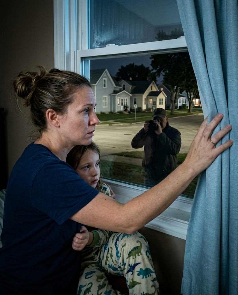 J’ai tiré si fort sur le rideau que la tringle a tremblé. Emma s’est mise à pleurer. J’ai attrapé mon téléphone et j’ai appelé le 112 d’une voix tremblante, essayant de parler à voix basse tout en décrivant l’homme, sa veste, l’appareil photo, l’endroit précis où il se tenait.