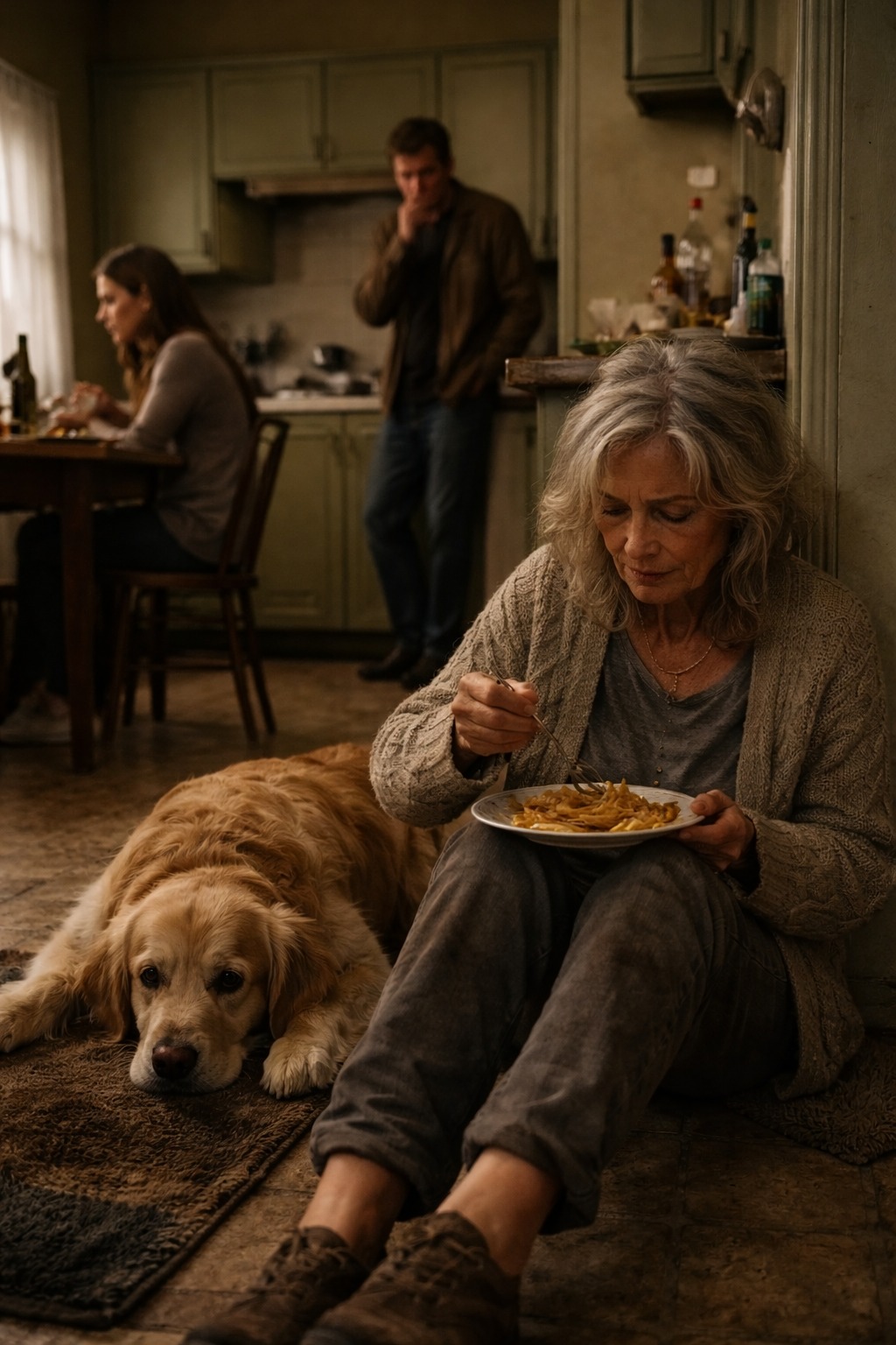 Assise sur le parquet froid, près du garde-manger, le dos légèrement voûté, une assiette posée délicatement sur ses genoux. Pain de viande, purée de pommes de terre, haricots verts. Elle mangeait lentement, délibérément, comme si elle cherchait à se faire discrète dans la maison de son propre fils.