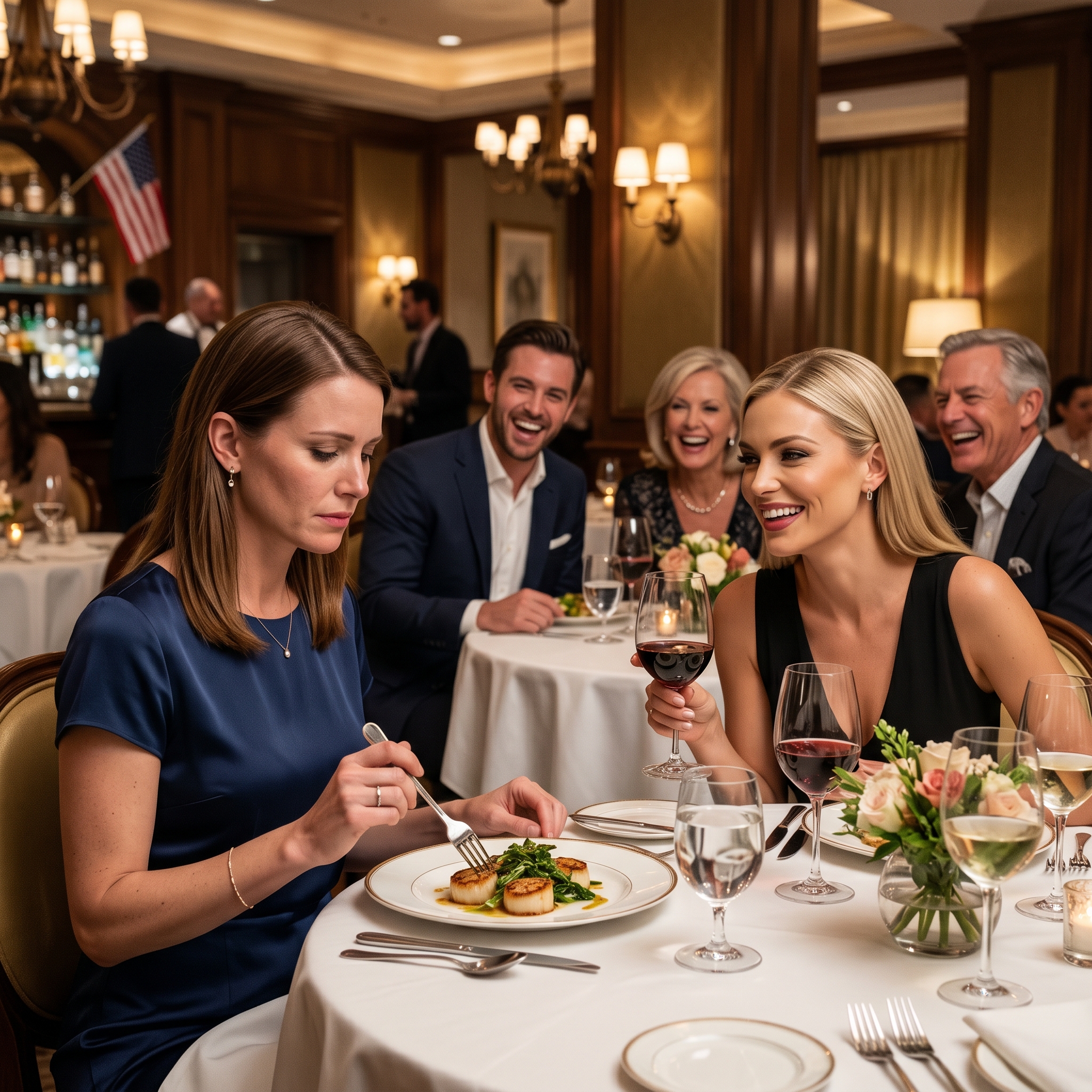 Pas littéralement. Mon père n’aurait jamais eu besoin que son nom soit imprimé nulle part pour se faire remarquer. Mais le restaurant, lui, si. L’endroit tout entier semblait avoir été choisi pour la mise en scène, pour être vu. Situé dans le West Loop, dans un ancien entrepôt reconverti, il arborait un pupitre d’accueil en pierre noire et un mur de vins éclairé comme un coffre-fort à bijoux. Les femmes portaient des robes noires structurées et parlaient à voix basse et calme. Aux tables voisines, les montres des hommes clignotaient discrètement lorsqu’ils portaient la main à leur verre. Le pain arrivait sur une ardoise, le beurre était parsemé de fleur de sel en parfaits flocons blancs, et chaque assiette ressemblait moins à de la nourriture qu’à une opinion onéreuse.