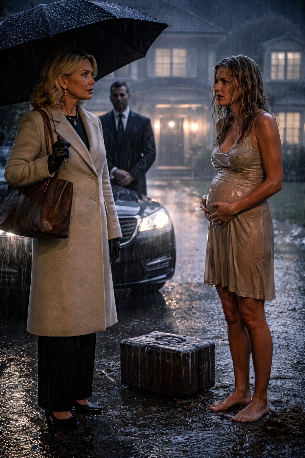 La pluie tombait à torrents sans relâche, des ruisselets froids et lourds comme si le ciel avait décidé de se vider d’un coup. Le perron en bois était devenu glissant, l’eau ruisselant sur les marches et reflétant la faible lueur de la lampe. Je me tenais pieds nus, les mains pressées contre mon ventre, sentant le froid s’insinuer plus profondément sous ma peau.