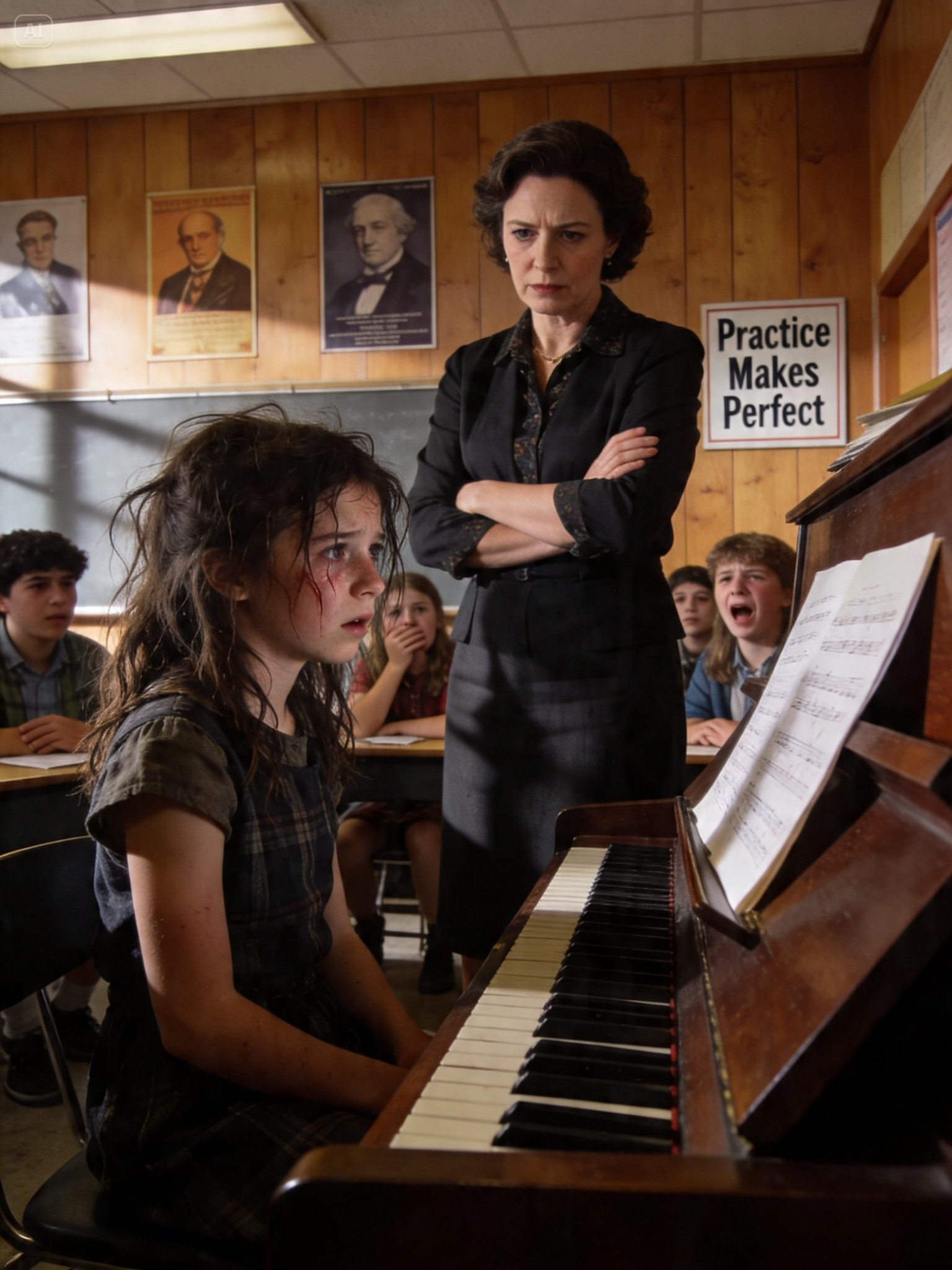Alors que la classe commençait à ranger ses affaires, le regard de Lily se porta sur le piano au centre de la pièce. Il trônait là, majestueux et silencieux, comme un objet important, reflétant la lumière qui l’éclairait.